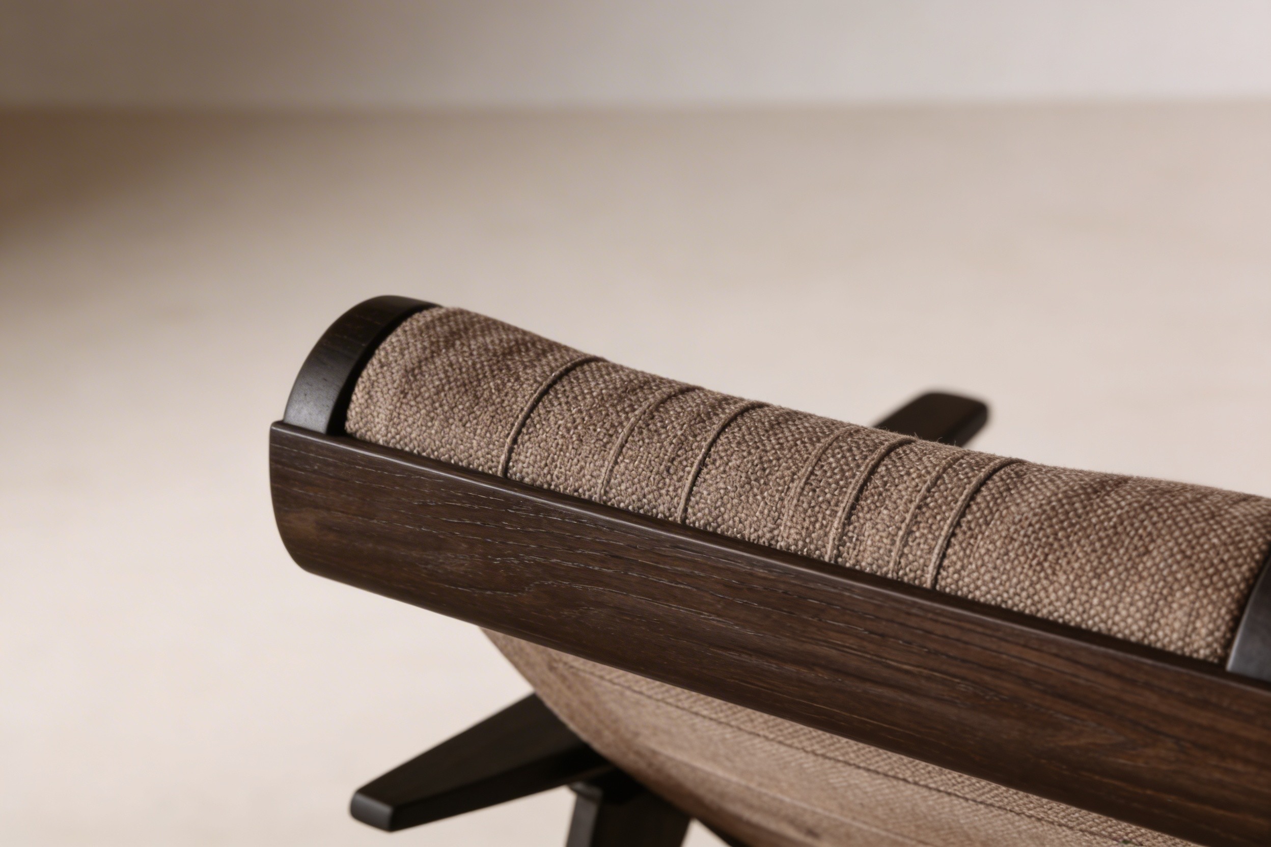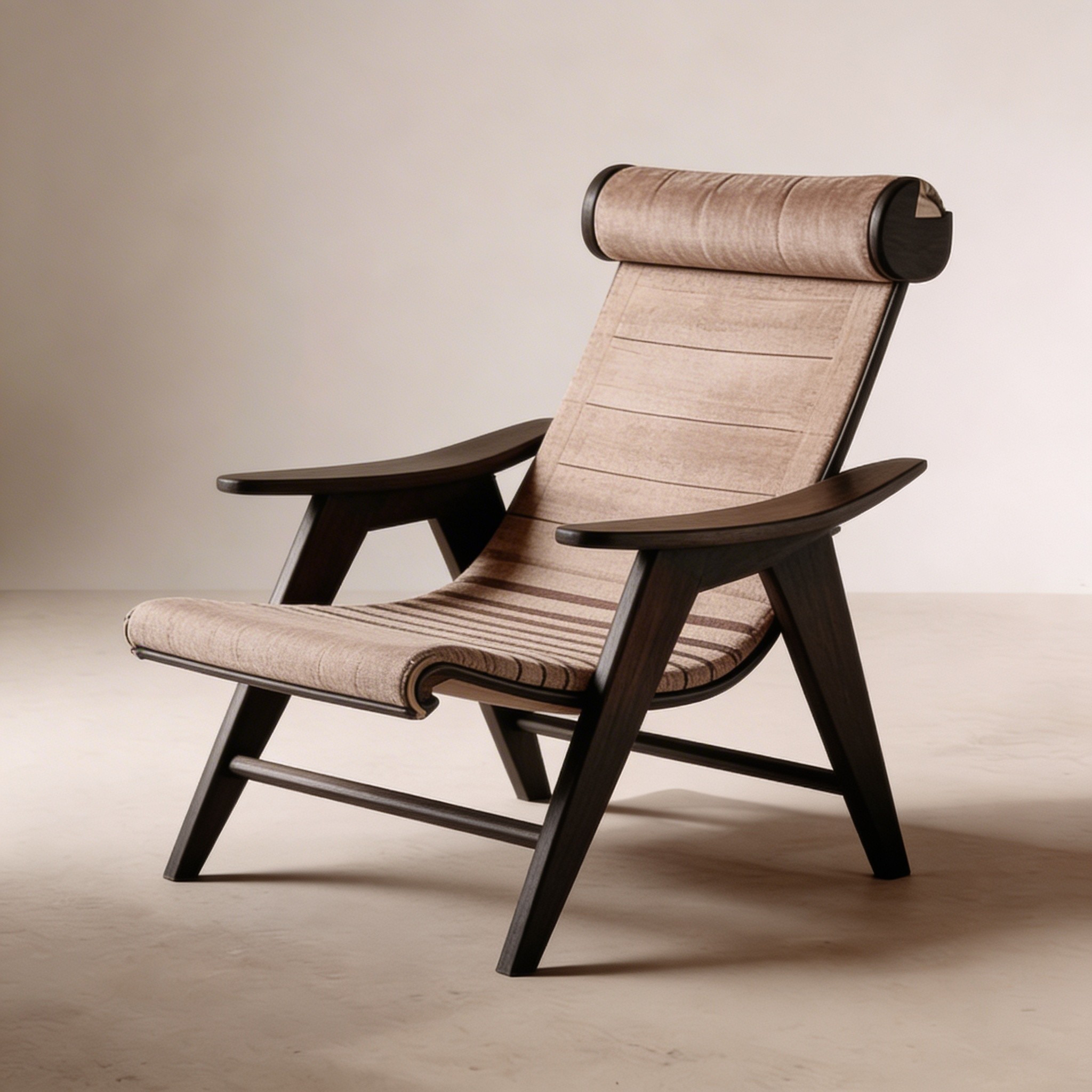 PROCESS: The chair was developed through a process of translating softness into structure: beginning with the simple act of a rolled mat or cushion, the design explored how that familiar cylindrical form could become an integrated headrest and visual anchor for the piece. From there, the frame was refined as a dark, sculpted wooden architecture with tapered legs and a continuous reclining profile that gives the chair both lightness and stability. The seat and back evolved as a suspended surface rather than a heavy upholstered volume, allowing the material wrapping to express comfort, tension, and craft at the same time. Material studies focused on the contrast between rich, dark timber, soft woven textiles, and aged leather, creating a balance between warmth, restraint, and tactile luxury. Throughout the process, joinery, ergonomics, and proportion were developed together so the final chair feels less like an assembled object and more like a single calm gesture—somewhere between furniture, ritual, and rest.